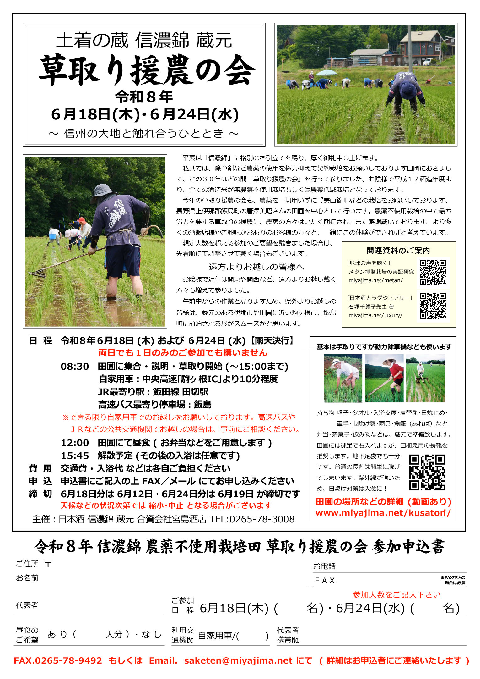 草取り援農の会 2026 2つのアルプスに抱かれた土着の蔵として、常に山の恵みに感謝し、米作り、酒造りを進めています。 信濃錦では、除草剤など農薬の使用を極力抑えて契約栽培をお願いいたしております田圃におきまして、この30年ほどの間「草取り援農の会」を行って参りました。 お陰様で平成17酒造年度より、全ての酒造米が農薬不使用栽培もしくは農薬低減栽培となっております。 今年の草取り援農の会も、農薬を一切使わずに『美山錦』などの栽培をお願いしております、長野県上伊那郡飯島町の唐澤美昭さんの田圃を中心として行います。 農薬不使用栽培の中で最も労力を要する草取りの援農に、農家の方々はいたく期待され、また感謝戴いております。より多くの酒販店様や、ご興味がおありの方々と、一緒にこの体験ができればと思います。 例年、参加された方々からは「朝の田圃は思ったより冷たくてビックリした。」とか「健康な田んぼだと実感した。」、あるいは「田圃の泥の中を歩く感触はクセになる!」などと、様々なご感想を戴いております。 開催要領は下記の通りです。信州の大自然と触れ合う中で、米作りの大切さや大変さを肌で感じて戴き、また未来の米作り・酒造りへの思いを広げて戴ければ幸いです。 開 催 日 程 な ど 令和8年6月18日(木) および 令和8年6月24日(水) 【雨天でも行います】 08:30 集合し草取り開始 12:00 田圃にて昼食 (お弁当) 12:45 再開(~15時頃) 15:45 解散予定 ※ご希望の方には入浴施設をご案内いたします GoogleMapによる 田圃の地図 交通費・入浴代などはご負担ください お申し込みの際、お名前、ご住所、参加日、参加人数、参加代表者の携帯電話番号、お弁当のご希望数につきましてお知らせください。 >> 申し込みフォーム Email:saketen@miyajima.net F A X:0265-78-9492 ※6月18日分は6月12日締切 6月24日分は6月19日締切です 申込書 PDF 申込書 Jpeg できる限り自家用車でのお越しをお願いしております。公共交通機関でのお越しをご希望の場合はご相談ください ⇒ 中央高速 駒ヶ根ICより約10分 ※荒天が予想される場合などは縮小・中止の場合があります |
